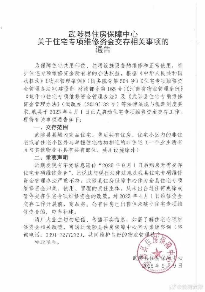 近日,武陟县委网信办在巡查中发现,某视频平台账号评论区有网民讨论“2025年9月1日后购房无需交存住宅专项维修资金”等相关信息,引发关注。经向县住房保障中心核实,此说法与现行法律法规及武陟县住宅专项维修资金管理办法严重不符,为虚假不实信息。