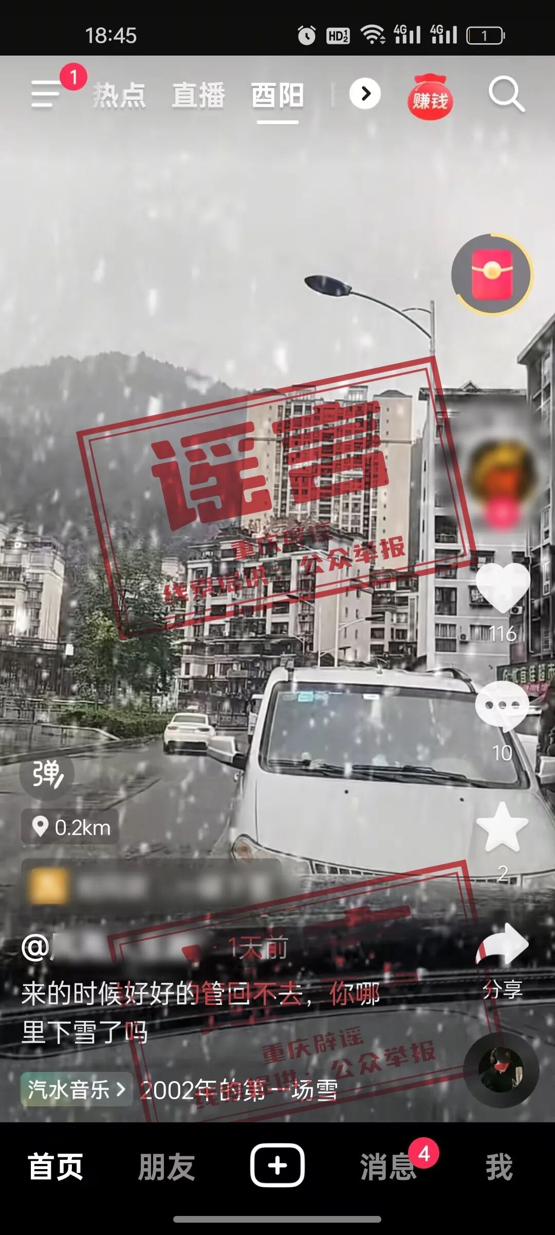 11月17日,有网民在互联网平台发布消息称“来的时候好好的管回不去”,画面显示为重庆酉阳县桃花源街道城北社区状元楼至阳光溪谷路段下雪,引发关注。经核实,该信息系谣言。