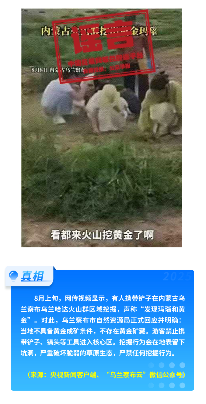 ??8月正值暑期,文旅消费旺,各类赛事多,相关谣言时有出现。“内蒙古乌兰哈达火山景区有黄金”虚假信息,误导游客违规挖掘,破坏生态环境;“山西大同华严寺殿墙遭游客刻字”传言,实为游客用手指在浮尘上涂画并非刻划。还有不法分子编造传播“成都世运会招募兼职,需交‘保证金’”“世运会内部票”“大神代抢”等信息,假冒官方名义实施诈骗,侵害公众权益。