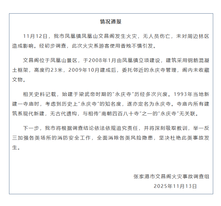 ??11月13日,江苏张家港市文昌阁火灾事故调查组发布情况通报: