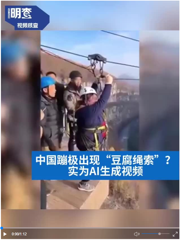 网传视频声称中国蹦极出现“豆腐绳索”,然而画面多处出现了AI生成视频常见漏洞,如手部异常、帧间不一致等现象,网传视频实为AI制作。