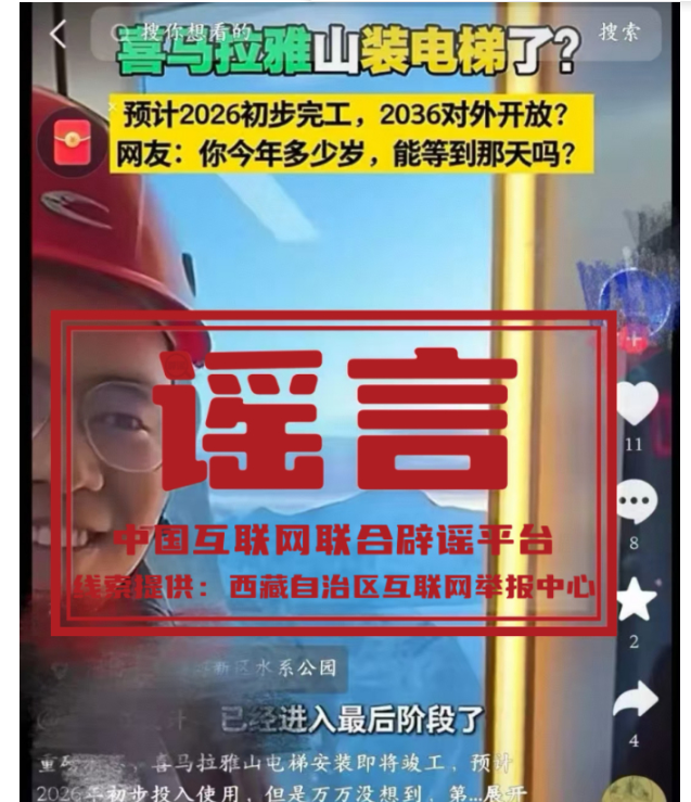 详情:近日,网络上频繁流传关于“珠峰安装电梯”“喜马拉雅山装电梯了?”等信息。对此西藏相关部门回应称,目前珠峰暂无安装电梯计划,网传图文视频为AI生成的虚假信息。部分营销号利用AI伪造西藏各类打卡景点的虚假图文视频,用虚假话术吸引流量、诱导消费,这些信息以“逼真画面+误导性表述”混淆视听,不仅会误导公众认知,还会严重扰乱清朗网络环境。对此,网信部门提醒:对编造散布谣言、扰乱公共秩序、造成恶劣社会影响的行为,公安机关将依法严肃查处。请广大网民不造谣、不信谣、不传谣,切勿轻信或传播非正规来源、未经证实的信息,一切以官方发布为准。(来源:“西藏举报”微信公众号)