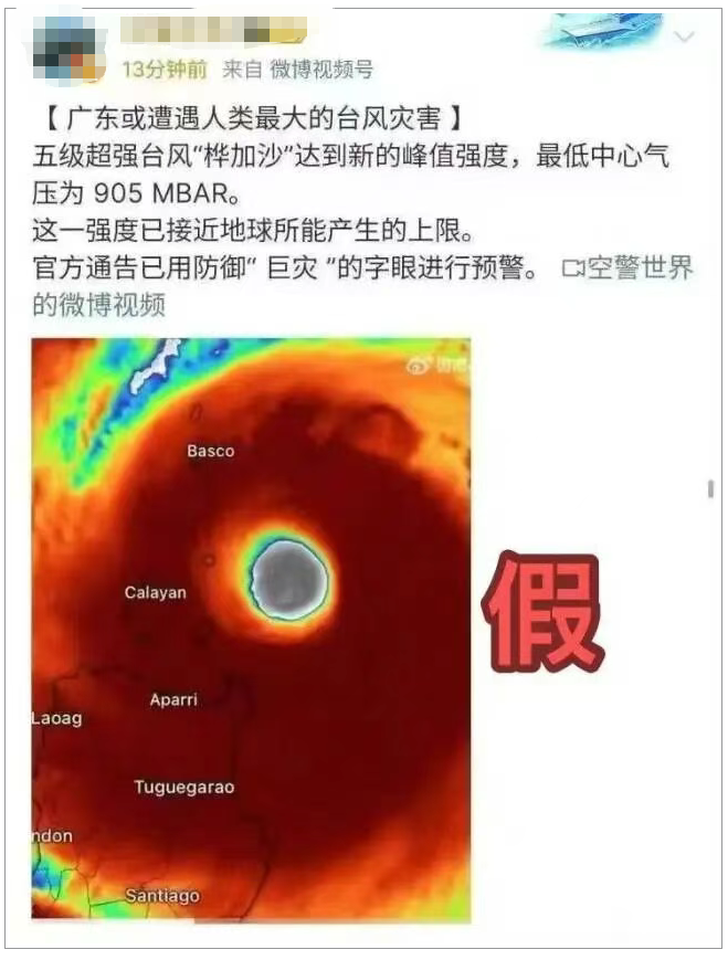 9月22日,自媒体“空警世界”发微博称,“广东或遭遇人类最大的台风灾害”,其在微博中提到,“超强台风‘桦加沙’达到新的峰值强度,最低中心气压为905MBAR。这一强度已接近地球所能产生的上限。”